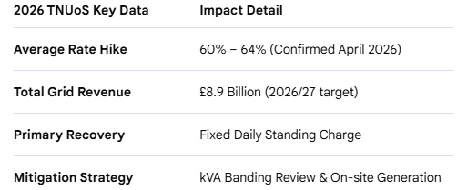 The £80 Billion Investment: Funding the RIIO-ET3 PeriodThe primary driver behind this month's increase is the start of the RIIO-ET3 regulatory framework (2026–2031). Under this new five-year plan, Transmission Owners are authorized to collect roughly £7.6 billion in revenue for the 2026/27 charging year to fund the 'Great Grid Upgrade.' This massive investment is essential for connecting remote renewable energy sources to the national network.This funding is essential for the Great Grid Upgrade, a series of massive infrastructure projects including:Eastern Green Link 1 (EGL1): A 2GW subsea "superhighway" linking Scottish wind power to the North of England.Grid Resilience: Modernizing 50-year-old pylons and substations to handle the surge in renewable energy.The EV Milestone: As of late March 2026, there are now nearly 2 million fully electric vehicles on UK roads, placing unprecedented demand on our high-voltage network.The "Fixed Cost" Trap: Why Efficiency Isn't EnoughUnder the Targeted Charging Review (TCR) reforms, over 90% of TNUoS costs are now recovered through fixed residual charges. Unlike your unit rate, which depends on how much power you use, these costs are applied as a fixed daily fee based on your 'voltage band.' This means even if you reduce your electricity consumption, your standing charge will remain high unless you address your site's capacity banding directly.